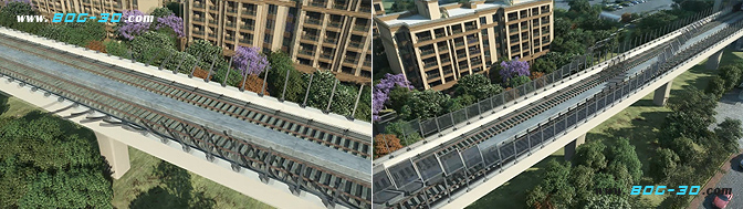 本案我們通過(guò)三維模擬地鐵經(jīng)過(guò)的一塊城市路段的場(chǎng)景,鏡頭半空俯視,開(kāi)始時(shí)是在沒(méi)有安裝聲屏障前,地鐵經(jīng)過(guò)時(shí),噪音非常的巨大;隨后通過(guò)生長(zhǎng)動(dòng)畫(huà)模擬聲屏障有序安裝的震撼過(guò)程;之后再次有地鐵經(jīng)過(guò)時(shí),周遭的噪音瞬間低了很多,再配以一些鳥(niǎo)聲,暗喻項(xiàng)目建成后,可以有效降低噪音,還生活原本的自然嫻靜!